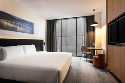 A comfortable stay is guaranteed in this stylish 25-28m² room featuring Tasmanian inspired design, Nespresso, 43-55" TV with BYO device connectivity, small chair & table, plush bed with premium linens, ensuite bathroom & rain shower. No view.