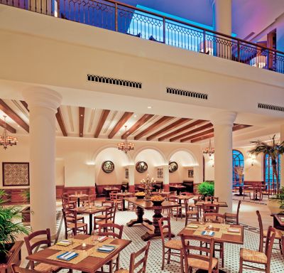 Experience a lively, authentic feel of Spain through the colours, decoration and uniforms in Tapeo Restaurant. You will feel the contrast of warm, wooden furniture and bar with a selection of cubist art. The central table with its candelabra and variety of citrus fruit and olive displays take you right to the heart of Spain. This is the place to enjoy the grandeur of the lobby and the warmth of Hispanic culture while listening to the sound of Flamenco guitar.